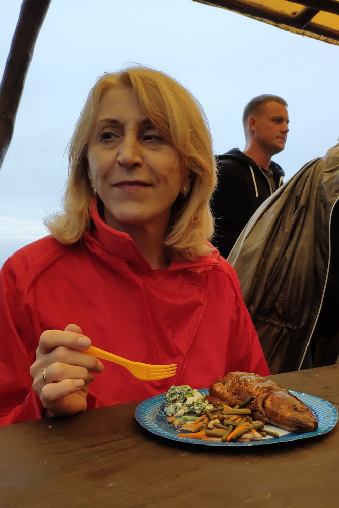 Как и любые около столичные жители, приехавшие наслаждаться красотой природы и видами окрестностей, первое что мы узнали — это есть ли WiFi в нашем жилище, и какой пароль. Всё это нам предоставили по первому же требованию. WiFi оказался без доступа в Интернет, и пока непонятно, что с этим делать. Как-то решим это позже. А пока пора обедать, так как в самолёте не кормили, сославшись на пандемию, а перелёт не близкий, почти 6 часов, плюс время до вылета и дорога от Иркутска. Столовая на первом этаже, спустились. Так как это был день прилёта, то мы там оказались одни, остальные, видимо, ещё не добрались до места. На обед подали салат из овощей, жаренную картошку с мясом и чай… в пакетиках. Насторожило… Девушка официант сказала, что с супом какие-то проблемы, извинилась, и добавила: «Ничего страшного, всё нормально». Вот это сервис, за нас же и ответили! Интрига…Но справедливости ради стоит отметить, что все дни нас кормили вкусно, сытно, можно сказать по-домашнему. Да и не это главное в таких путешествиях.
