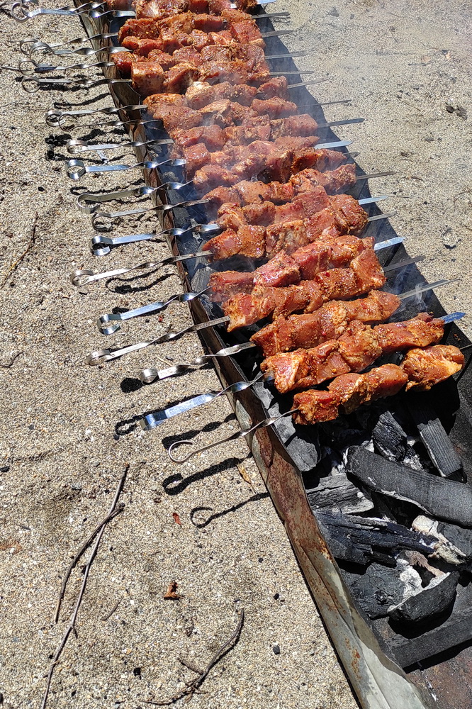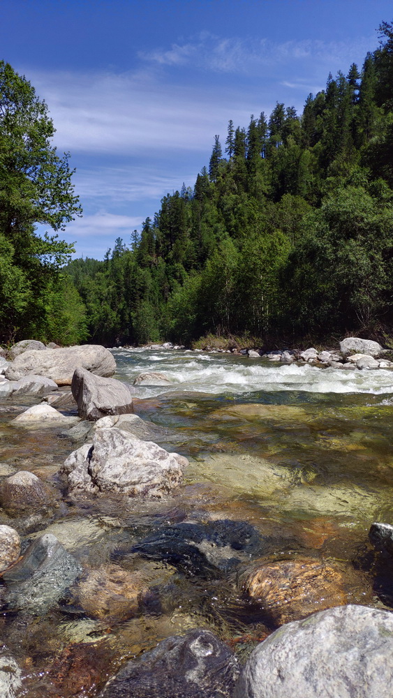 Пока мы любовались природой и фотографировались, наш провожатый, звали его Сергей, успел развести костер, приготовил шашлыки, чай из местных трав — все очень вкусно и здорово! Несмотря на холодную воду, градусов 15, а то и все 10, вся группа решила искупаться в горной речке. Заводь была небольшая, поэтому купание свелось к погружению в воду и быстрому возврату на берег. А особо стойкие, ещё успевали внимательно осматривать окрестности.
