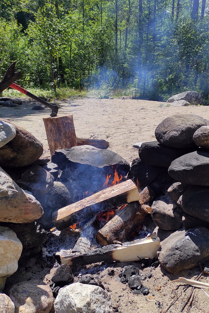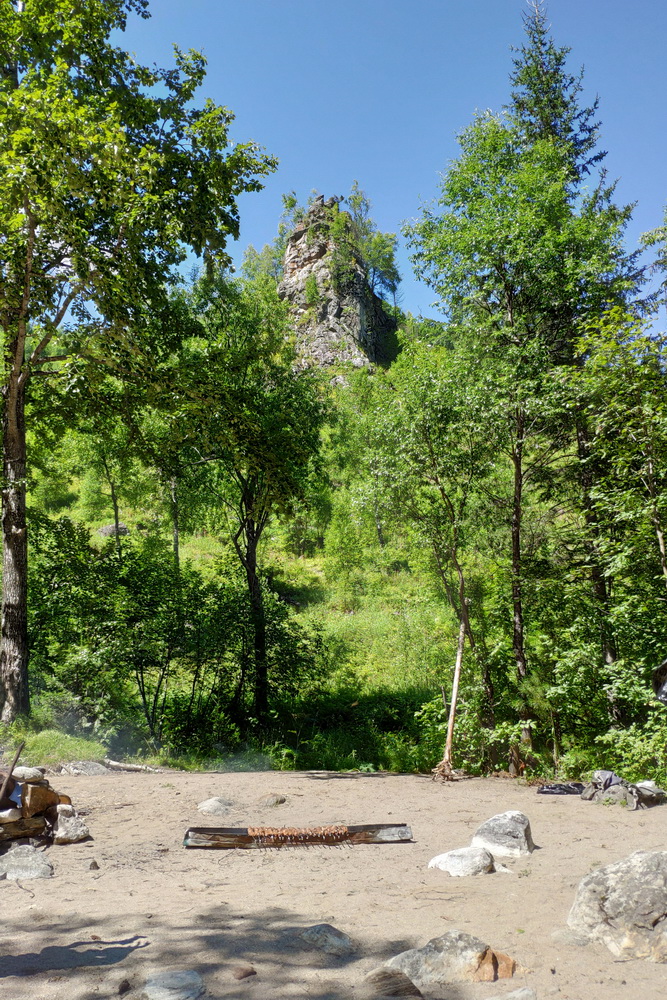 Мы все налегке, а гид, и по совместительству директор принимающей стороны, бодро шагал с огромным рюкзаком, где оказалась еда на всю группу и прочие приспособления для её готовки и поедания. Пройдя так километров пять по лесной грунтовой дороге, которая скоро сузилась до тропинки, мы добрались до места. Перед нами открылась большая поляна возле реки с видом на высокую скалу — это и был тот самый Чертов палец, на который часть группы чуть позже совершила восхождение.