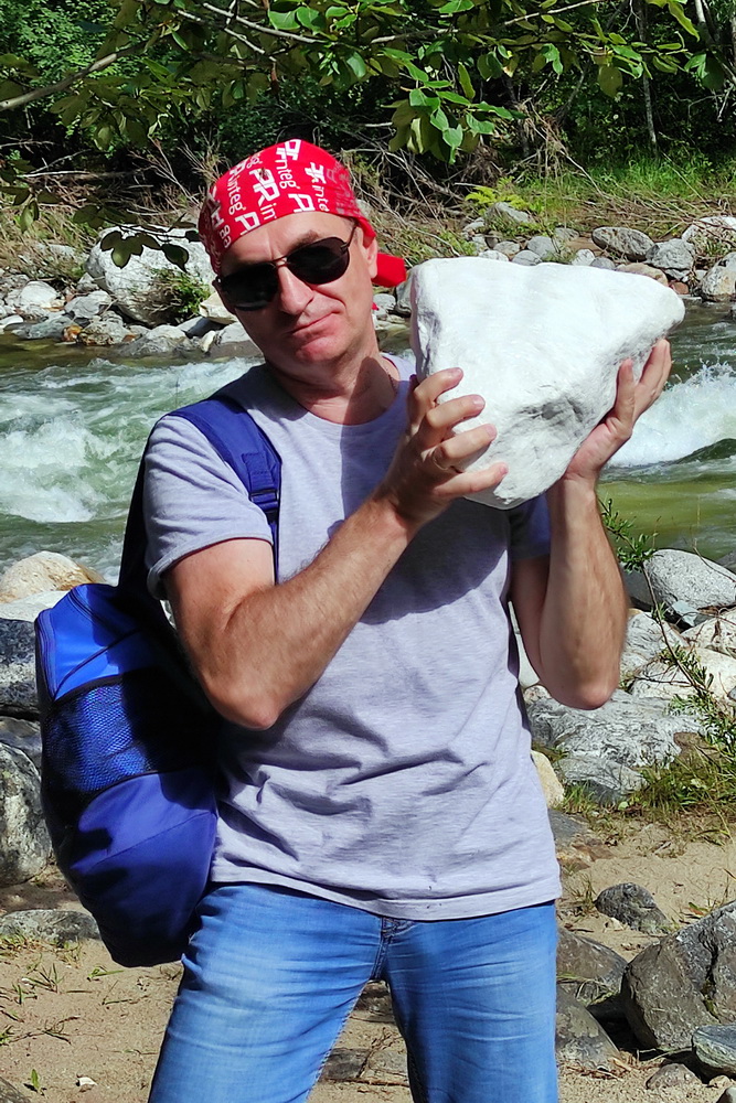 Прекрасно провели время на берегу, сделали фотки, позагорали и выдвинулись к дому. На обратном пути фотографировали то, что не успели ранее. И конечно же, выкопали чайную траву с корнем, для её транспортировки домой. Будем выращивать её у себя в овраге. Забегая вперёд, скажу, что трава эта доехала в полном здравии до места, уже посажена и чувствует себя прекрасно. Сегодня её чуть не скосил, но это по секрету… Не было ещё такой поездки, с которой мы бы не привезли камни. Этот прекрасный образец белого мрамора, им в Байкальске отсыпаны дороги и дворы, чуть было не последовал за чайной травой, остановило только то, что багаж ограничен 10-ю кг. Но, как вы уже догадались, несколько более мелких экземпляров всё-таки перекачивало в наш багаж.